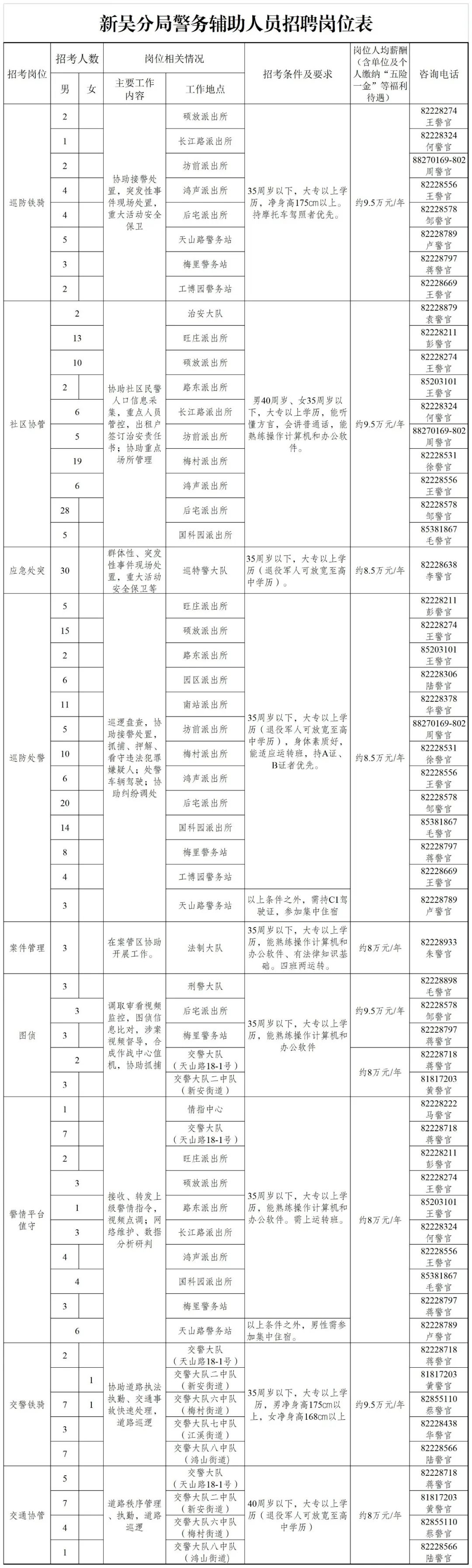 2023-05-14 23:46:56閱讀()新吳區(qū)人民政府因公安工作需要,新吳公安分局決定面向社會(huì)公開(kāi)招聘警務(wù)輔助人員(非人民警察身份且非事業(yè)編制人員身份)347名,現(xiàn)將有關(guān)事項(xiàng)公告如下: