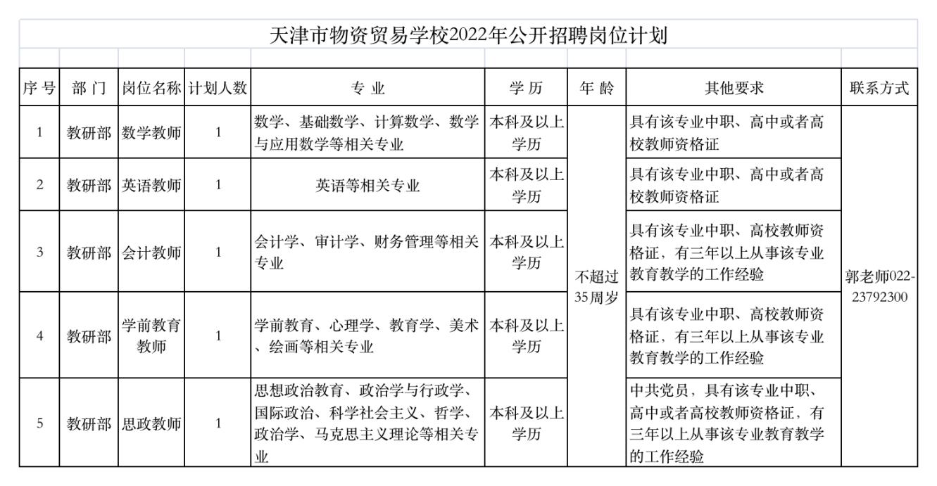 具體招聘崗位見《天津市物資貿(mào)易學(xué)校2022年公開招聘崗位計劃》。