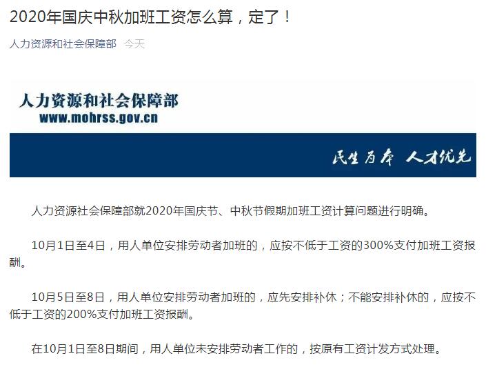 人社部明確國(guó)慶中秋加班工資:10月1日至4日加班發(fā)3倍工資