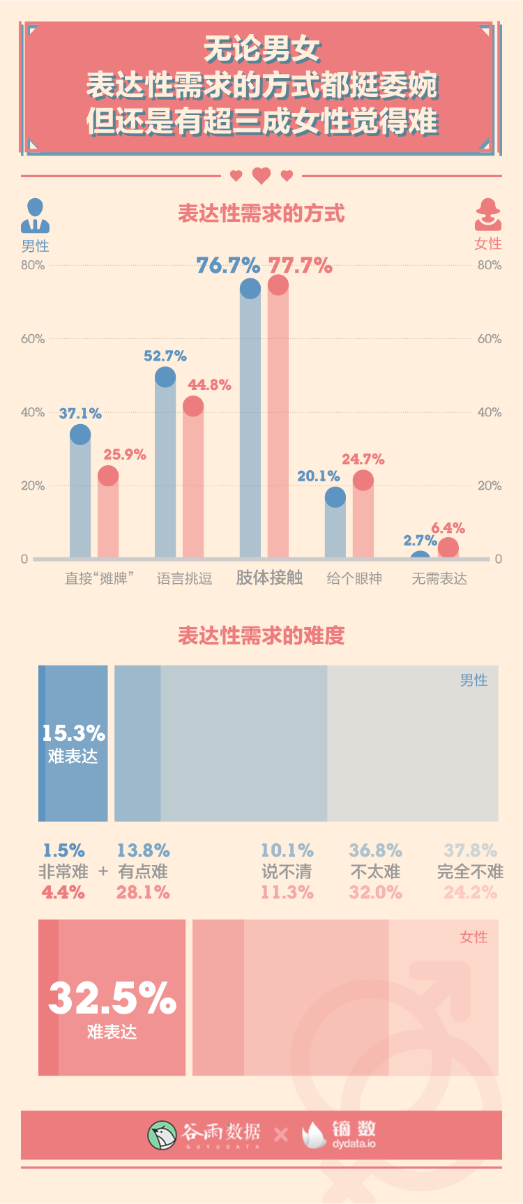 總體上看,無論男女都最傾向通過“肢體接觸”傳遞性需求,其次是“語言挑逗”,直接“攤牌”的比例較低。