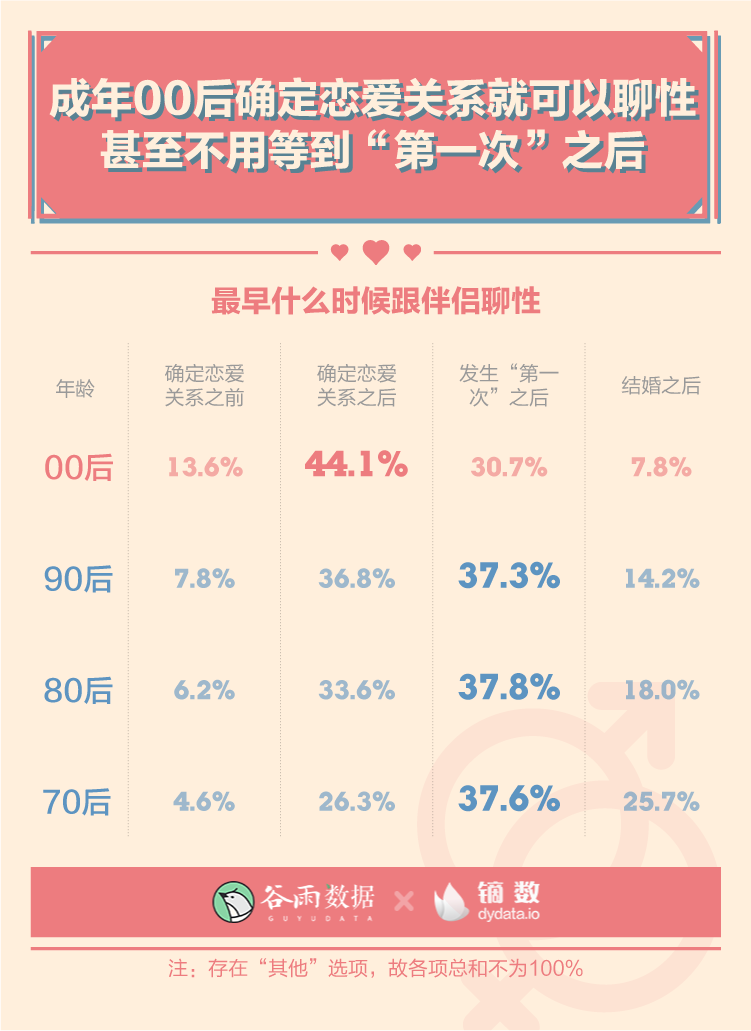 在性表達方面,00后的開放程度的確也更高。44.1%的成年00后認為確定戀愛關(guān)系就可以聊性,而其他年齡段更傾向認為要等到發(fā)生“第一次”之后。
