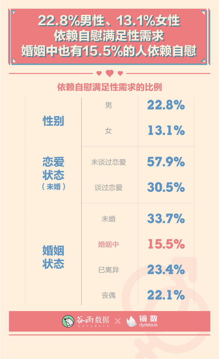 22.8%的男性、13.1%的女性當前依賴自慰滿足性需求。