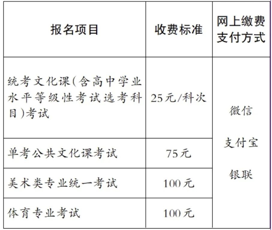 不同報(bào)名項(xiàng)目費(fèi)用有所不同,其中統(tǒng)考文化課(含高中學(xué)業(yè)水平等級(jí)性考試選考科目)考試為每科次25元,單考公共文化課考試報(bào)名費(fèi)為75元,美術(shù)類專業(yè)統(tǒng)一考試和體育專業(yè)考試兩項(xiàng)目報(bào)名費(fèi)各為100元。