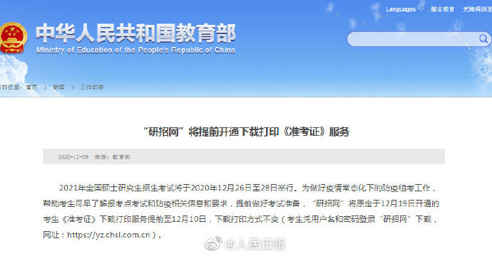 2020-12-09 18:12:57閱讀()研招網(wǎng)速遞!“研招網(wǎng)”將提前開通下載打印《準(zhǔn)考證》服務(wù)