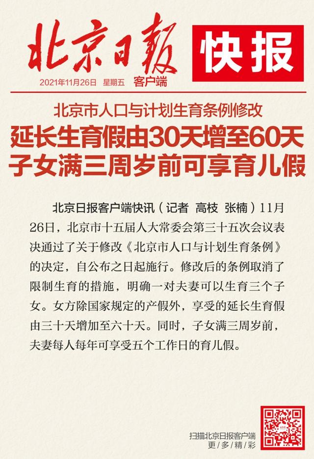11月26日上午,北京市十五屆人大常委會第三十五次會議表決通過了關(guān)于修改《北京市人口與計劃生育條例》的決定,自公布之日起施行。修改后的條例取消了限制生育的措施,明確一對夫妻可以生育三個子女。女方除國家規(guī)定的產(chǎn)假外,享受的延長生育假由三十天增加至六十天。同時,子女滿三周歲前,夫妻每人每年可享受五個工作日的育兒假。