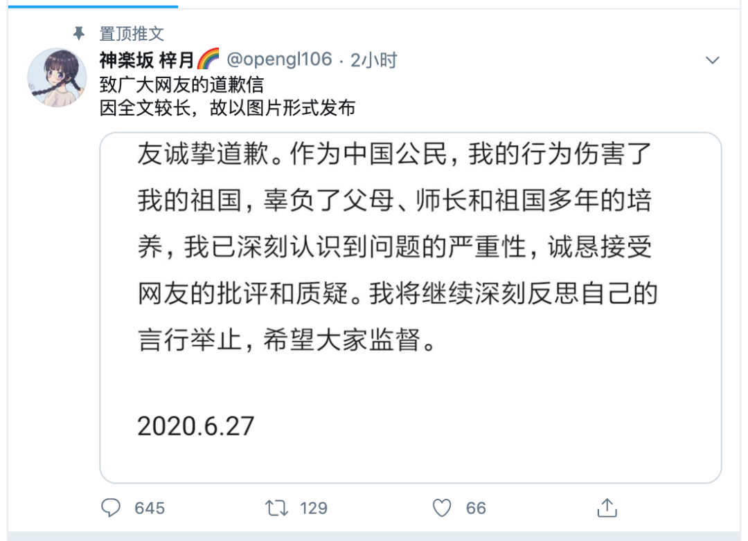 作為中國(guó)公民,我的行為傷害了我的祖國(guó),辜負(fù)了父母、師長(zhǎng)和祖國(guó)多年的培養(yǎng),我已深刻認(rèn)識(shí)到問題的嚴(yán)重性,誠(chéng)懇接受網(wǎng)友的批評(píng)和質(zhì)疑。我將繼續(xù)深刻反思自己的言行舉止,希望大家監(jiān)督。