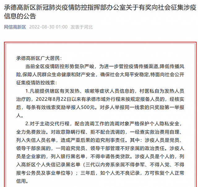 同日早前,“網(wǎng)信高新區(qū)”微信公眾號消息,承德高新區(qū)新冠肺炎疫情防控指揮部辦公室通告,當前全區(qū)疫情防控形勢復雜嚴峻,為進一步管控疫情傳播渠道,降低傳播風險,保障人民群眾生命健康和財產(chǎn)安全,確保社會大局平安穩(wěn)定,特面向社會公開征集疫情防控線索: