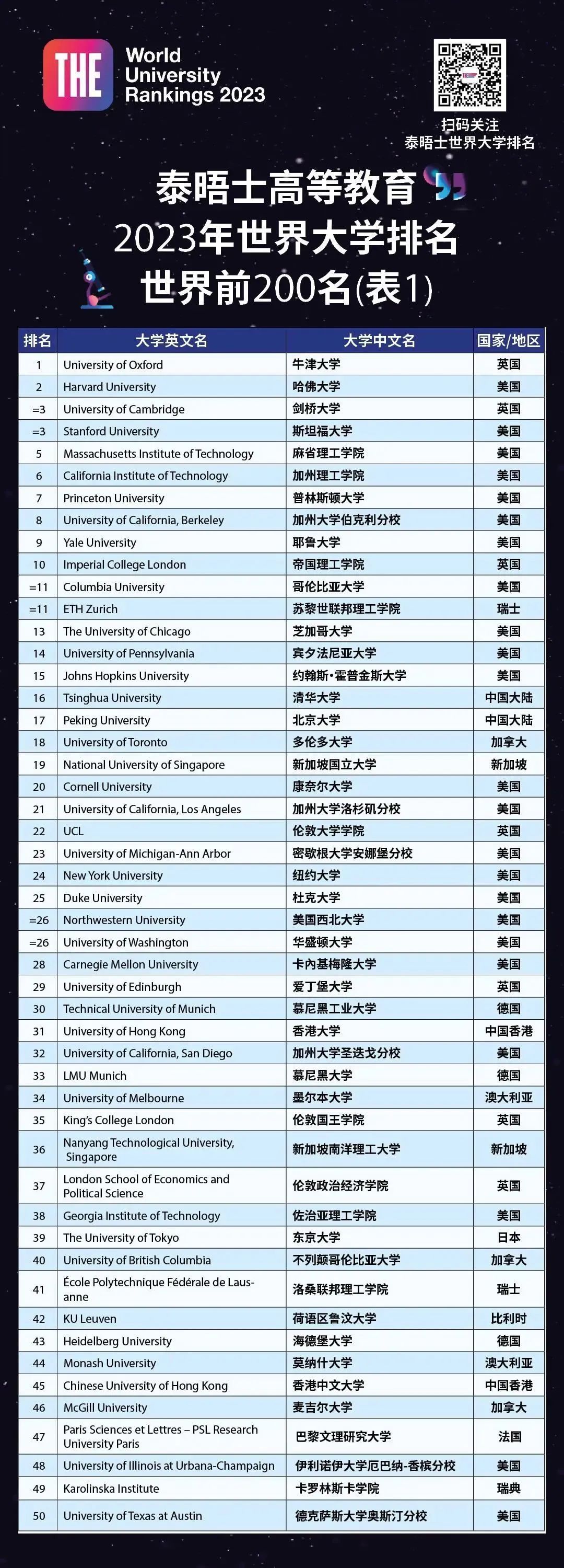 先看看《泰晤士2023年世界大學(xué)排名》前50強(qiáng):