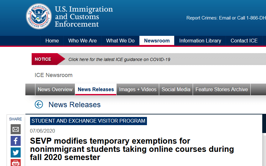 ICE在其官網(wǎng)發(fā)布的聲明中說(shuō),計(jì)劃于今年秋季學(xué)期入學(xué)的國(guó)際學(xué)生只要有至少一門(mén)“線下”課程即可獲得學(xué)生簽證進(jìn)入美國(guó);如果全部課程皆為網(wǎng)課,則不會(huì)獲得簽證,不得入境。今年3月9日前已經(jīng)入學(xué)的國(guó)際學(xué)生將不受該規(guī)定影響。