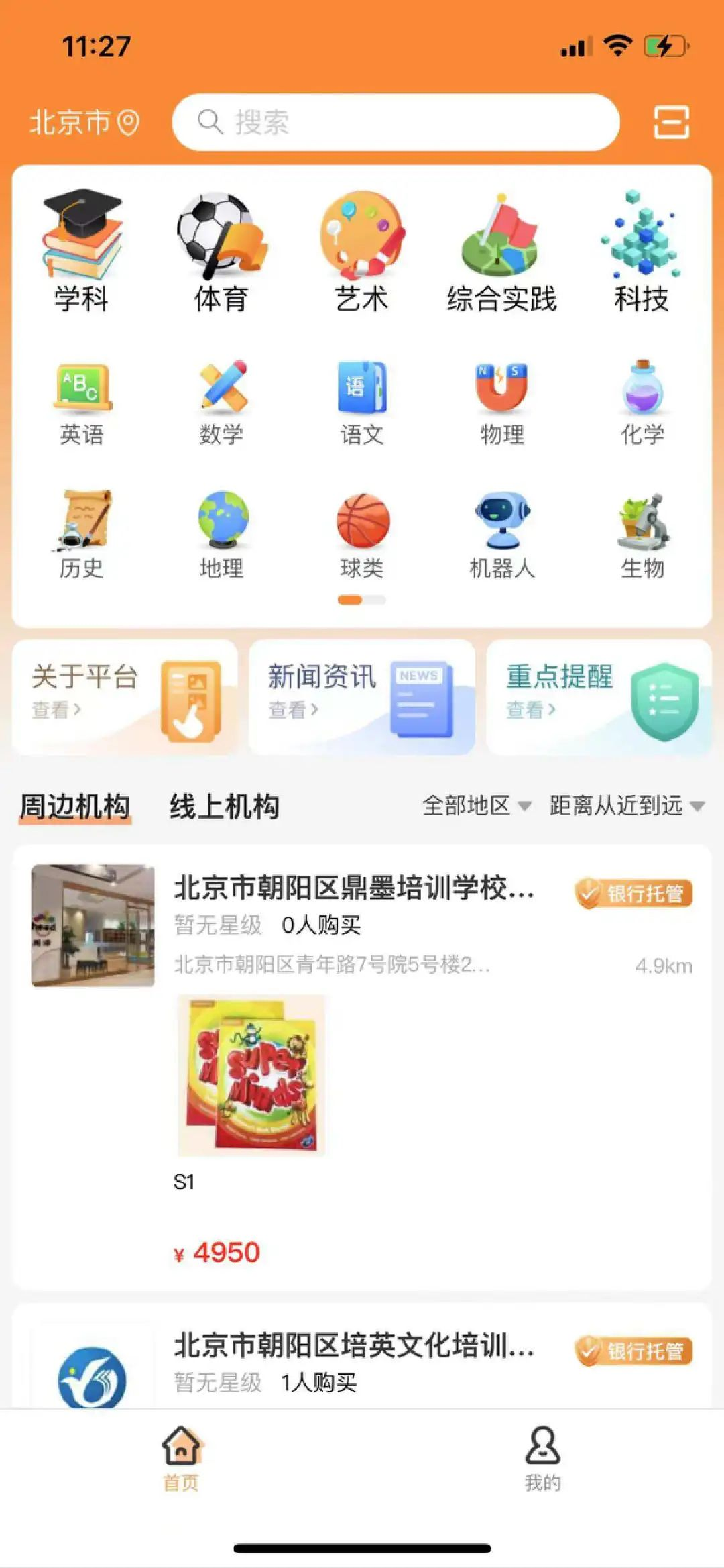 在“校外培訓(xùn)家長端”App首頁,有學(xué)科、體育、藝術(shù)、綜合實(shí)踐、科技、英語、數(shù)學(xué)、語文、物理、化學(xué)、歷史、地理等所有校外學(xué)科,集中了當(dāng)?shù)氐木€下教育培訓(xùn)機(jī)構(gòu)。
