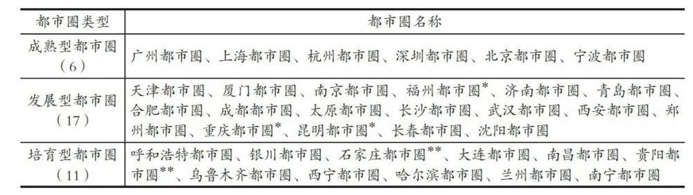 根據(jù)清華大學(xué)中國(guó)新型城鎮(zhèn)化研究院組編的《中國(guó)都市圈發(fā)展報(bào)告》,我國(guó)共有6個(gè)成熟型都市圈、17個(gè)發(fā)展型都市圈、11個(gè)培育型都市圈。