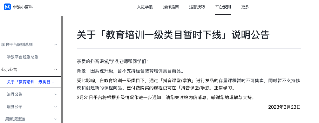 3月24日消息,日前,學(xué)浪面向抖音課堂 學(xué)浪的用戶發(fā)送《關(guān)于「教育培訓(xùn)一級(jí)類目暫時(shí)下線」說明公告》通知。學(xué)浪方面稱,因系統(tǒng)升級(jí),暫不支 ...