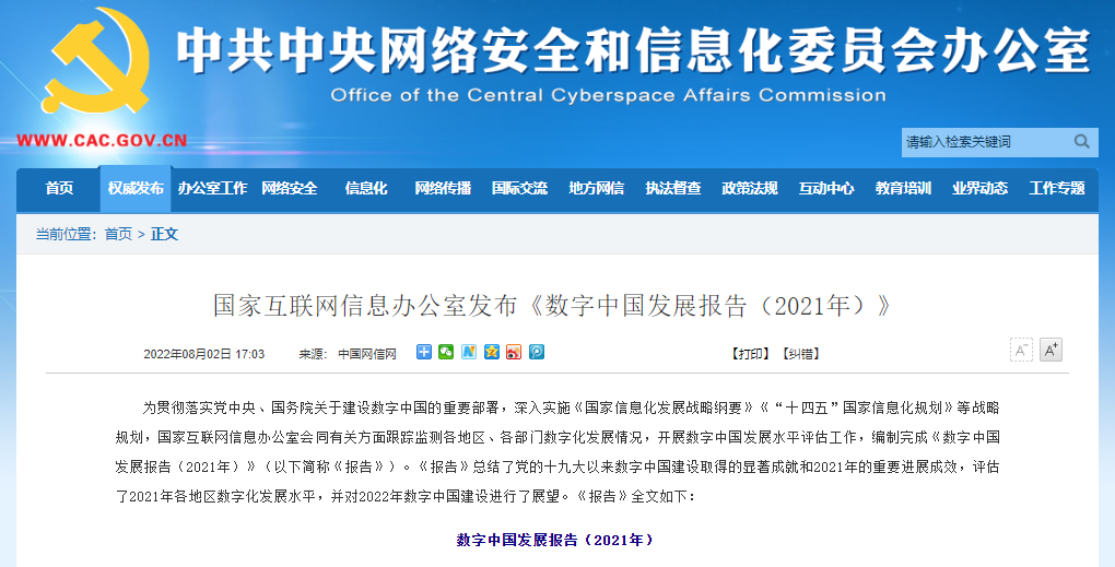 8月3日消息,為評(píng)估2021年各地區(qū)數(shù)字化發(fā)展水平,并對(duì)2022年數(shù)字中國(guó)建設(shè)進(jìn)行展望,國(guó)家互聯(lián)網(wǎng)信息辦公室昨日發(fā)布了《數(shù)字中國(guó)發(fā)展報(bào)告(202 ...