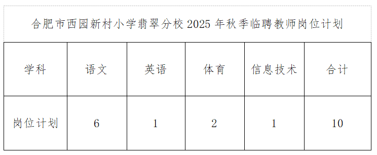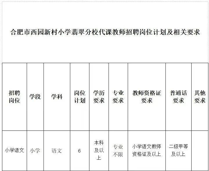 附件:合肥市西園新村小學(xué)翡翠分校代課教師招聘崗位計(jì)劃表及相關(guān)要求
